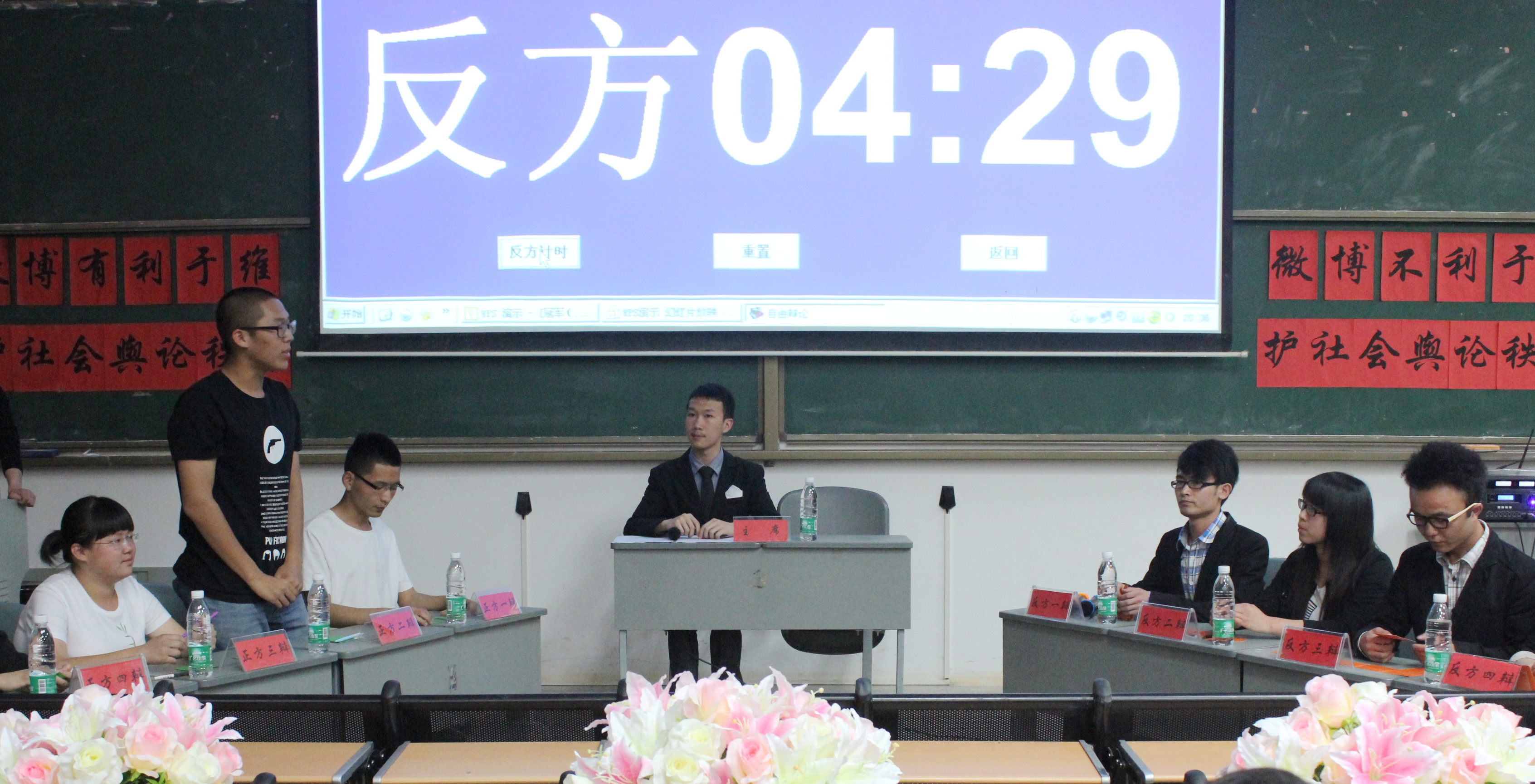 决赛是由编辑111班对战传播111班,本场比赛的辩题为“微博有/不利于维护社会舆论秩序”,正方为编辑111班,反方为传播111班。编辑111班是上一届辩论赛的冠军得主,同时作为本届辩论赛的种子队,他们以绝对实力夺得小组赛冠军,进入总决赛冠亚军争夺;传播班的实力也不容小觑,他们冷静沉着、有条不紊地陈述自己的观点。辩题紧跟社会热点,作为新闻专业的同学对微博是否有利于维护社会舆论秩序,有着自己独特且富有专业性的见解。现场气氛紧张激烈,辩手们的表现极富感染力,带动了现场观众们高昂的情绪。