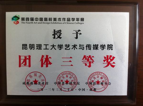 2012级硕士研究生刘云同学的作品《七彩云南,和谐民族》,2010级本科生陈珊同学的《舞在云南》、郭怡江同学的《云南元素》、唐凤莉同学的《云南元素剪纸设计》、蒋林晋等同学的《轨迹》、林晶同学的《交汇》、朱小玲同学的《孔雀舞之魂》、周靖然同学的《云南少数民族节日之最》、李亚楠同学的《云南瓦猫》、李嘉美同学的《静夜思》、刘圣婷同学的《不要让它成为拼图》,2011级本科生李冬红同学的《生命》、尹瀚贤同学的《泡饭》等获大学组优秀作品奖;