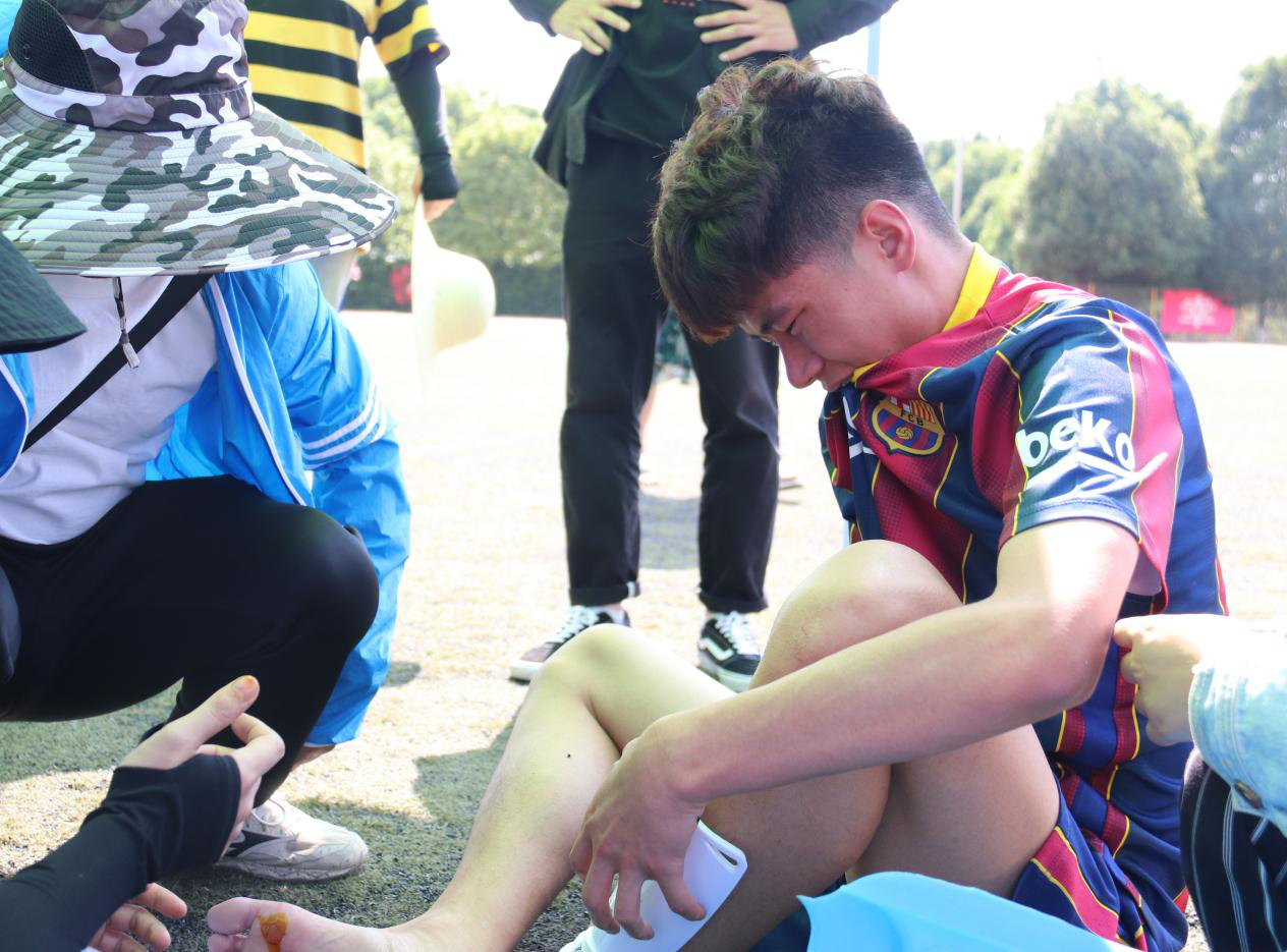 在激烈的角逐过程中,双方都有队员负伤,进行包扎之后,他们并没有放弃,依然在绿茵场上坚持到球赛结束,展现了永不言弃的体育精神。