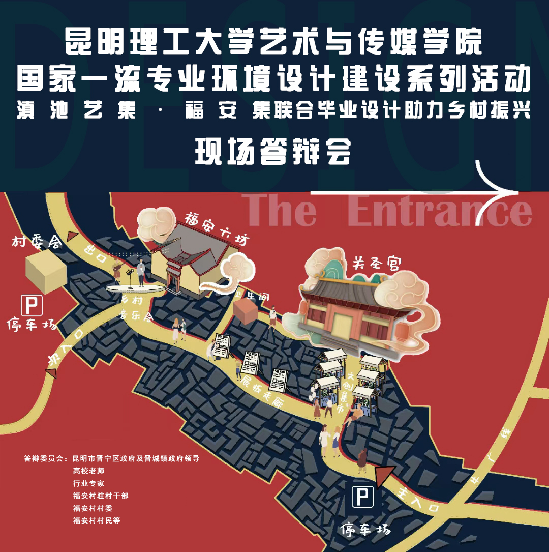 国家一流专业环境设计建设系列活动,“滇 池 艺 集 · 福 安 集”2021届联合毕业设计助力乡村振兴现场答辩。由昆明市晋宁区政府及晋城镇政府领导、高校老师、行业专家、福安村驻村干部和村委、村民等20余人共同组成答辩委员会,进行现场答辩。本次2017级现场毕业答辩由环境设计系38名学生参加,8位专业老师指导完成,23组设计作品(80张展品)。通过多专业协同,以艺术设计介入乡村振兴,以联合设计助力产业升级,以艺术市集激活内生动力,实现了艺术与乡村振兴的有机结合。