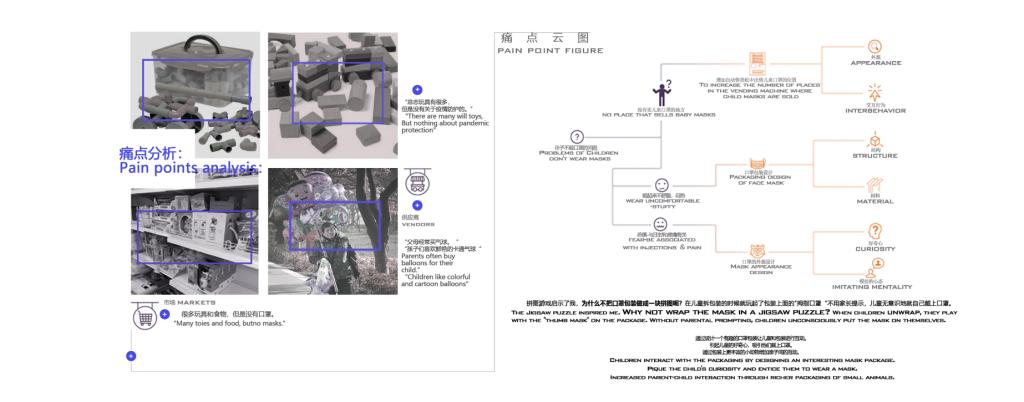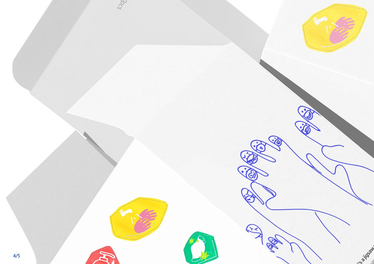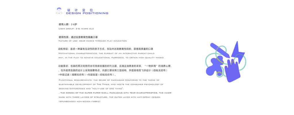 The mask packaging is presented in abundant color to attract attention, using a jigsaw puzzle of epidemic protection ICONS as packaging, with elaborate parent-child games and interactive behavior. Each element on the box features an epidemic protection icon and a small mask that can be placed on a child's finger to make the act of wearing a mask appreciated by people from the bottom of heart. The purpose is to integrate the awareness of epidemic prevention into children's daily life, guide children to wear masks and improve their awareness of epidemic prevention. Children as the vulnerable groups on earth, We should pay more attention to the harmony between children and the environment.