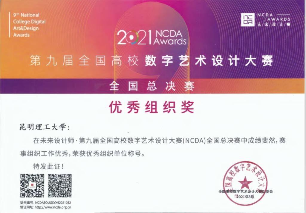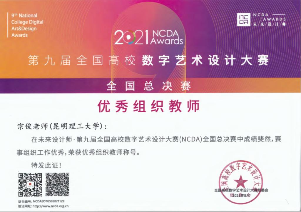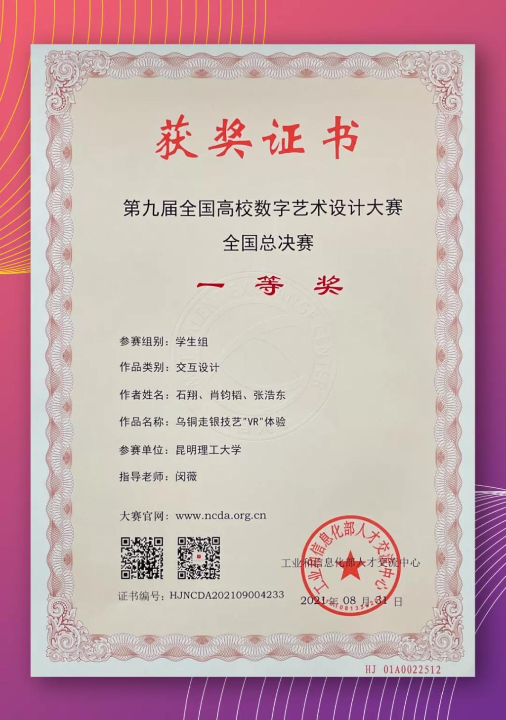 2017级数字媒体专业本科学生团队:石翔、肖钧韬、张浩东团队作品《乌铜走银技艺“VR”体验》(指导教师-闵薇)获得了全国高校数字艺术设计大赛全国一等奖,宗俊老师获得全国总决赛优秀组织教师,厂长影视