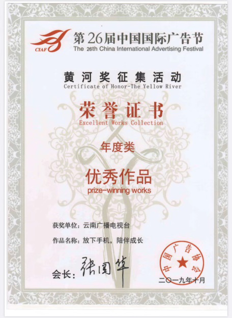 广播电视专业硕士生仪欣妍、葛宇航、刘雅彤创作的公益广告《放下手机 陪伴成长》荣获第26届中国国际广告节黄河奖年度优秀奖。这是云南高校学生作品首次获得中国国际广告节黄河奖。