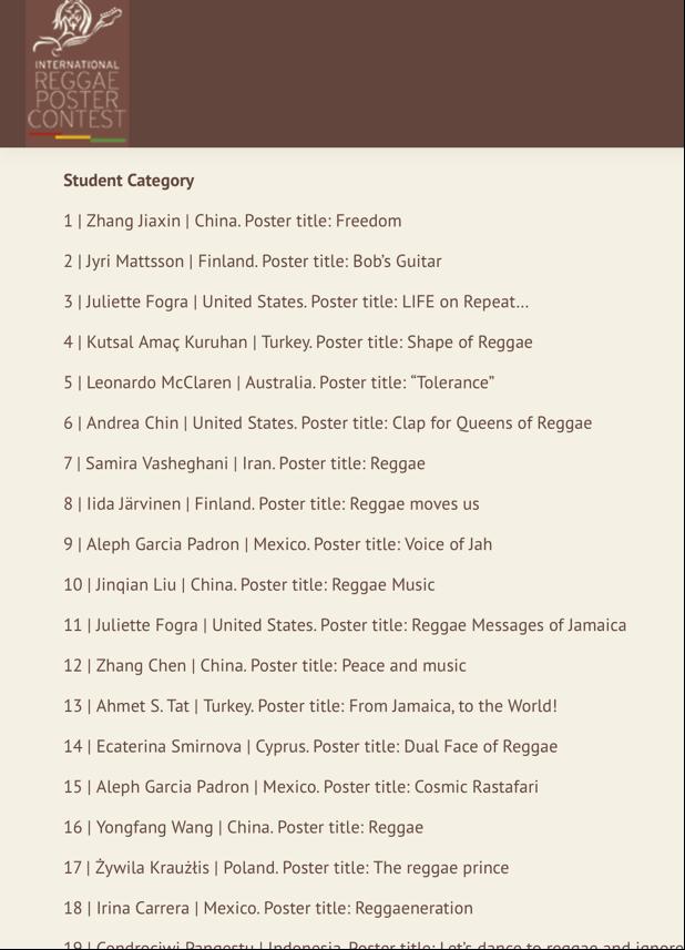 国际雷鬼音乐海报设计比赛(IRPC)创立于2011年,每年面向全球设计师举办一次,用以传播、弘扬雷鬼音乐——一种由斯卡(Ska)和洛克斯代迪(Rock Steady)音乐演变而来的牙买加流行音乐,已经成为世界摇滚音乐的主流。国际雷鬼音乐海报设计大赛是一项全球运动,它利用社会媒体和创意表达的强有力的工具,促进雷鬼音乐的全球化。以“走向名人堂的雷鬼:庆祝伟大牙买加音乐”为2020年第七届的主题,比赛共征集到来自79个国家、地区667名设计师的1100件作品,比赛分为专业组和学生组。在100名获奖者中,60名属于专业类别,40名是学生。