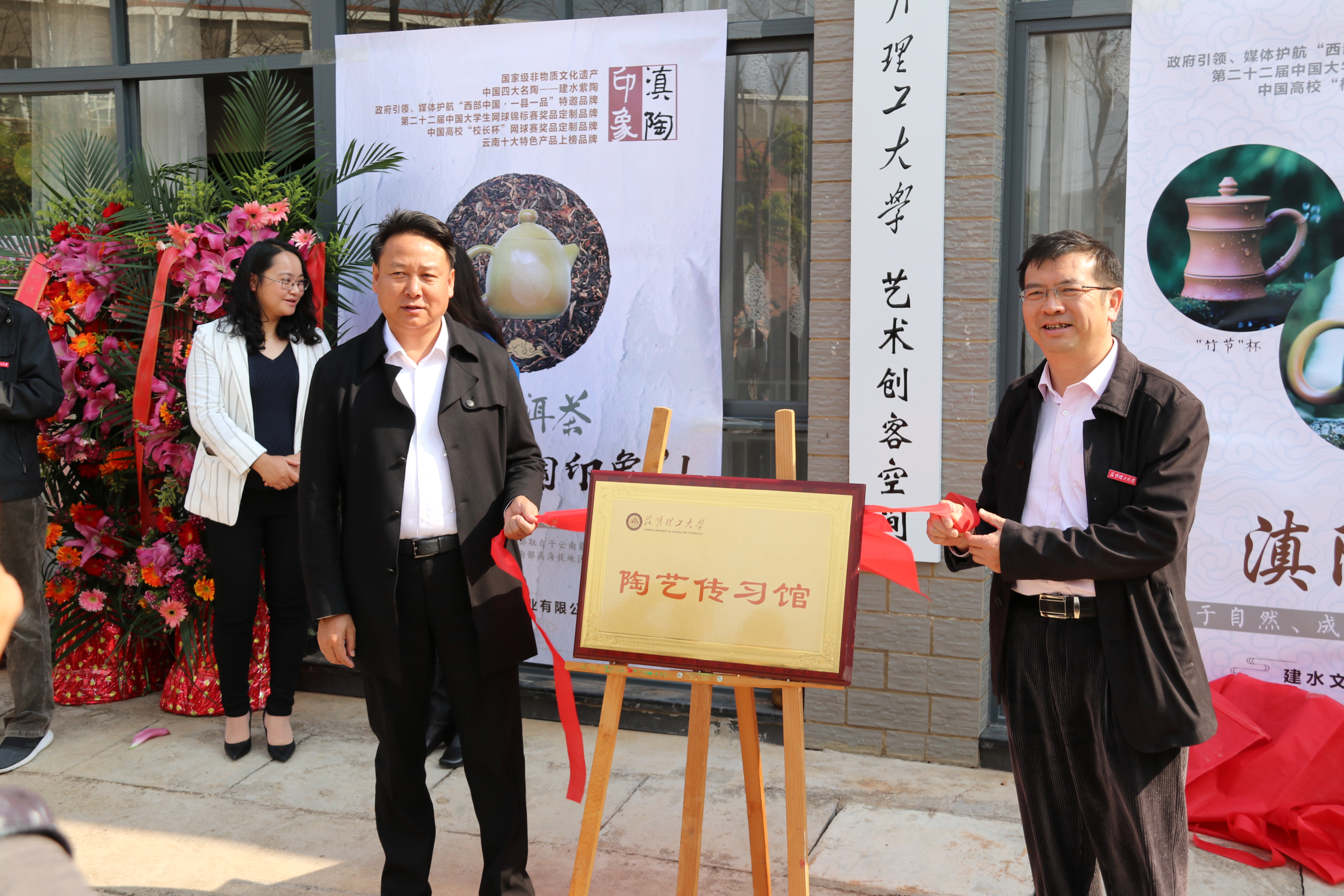 党委常委、副校长牛治亮、周峰越,中共建水县委常委、宣传部部长杨为文,建水县紫陶产业发展中心主任童石磊,建水文冶陶业有限公司董事长李俊荣,云南画报社副社长李敏,厂长影视