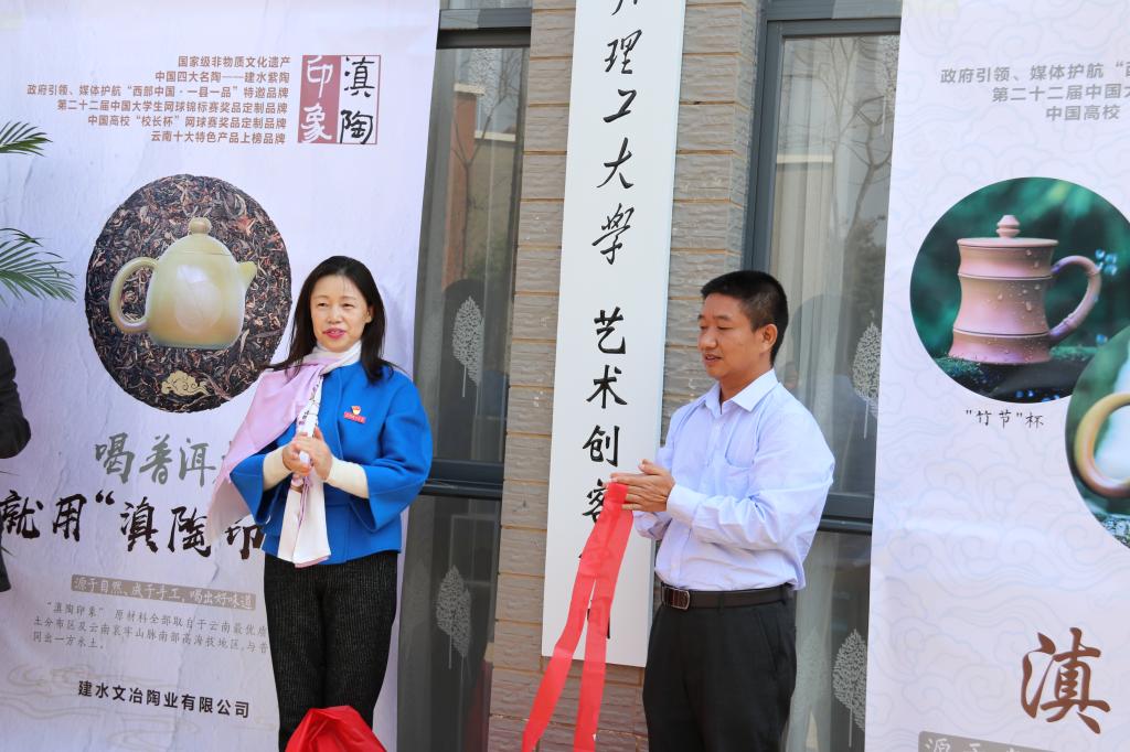 院长许佳在讲话中感谢学校领导和校友、建水县领导对艺术创客空间成立的支持。她说,学院将利用艺术创客空间开展艺术工坊式教学,打造特色艺术类课程,提升我校人才培养的质量。随后,张英杰书记与文冶陶业有限公司董事长李俊荣共同为艺术创客空间揭牌,牛治亮副校长与中共建水县委常委、宣传部长杨为文共同为陶艺传习馆揭牌。