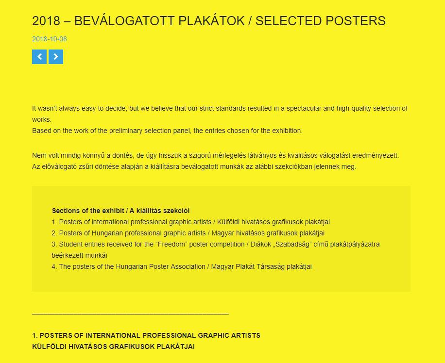 布达佩斯国际海报节由匈牙利海报协会主办,每两年举办一次,旨在庆祝海报艺术节,并展示海报在现代视觉设计中的作用。大赛无主题限制,要求近两年内创作的作品,每人限投3幅,由国际评审委员会评审。获奖作品于2018年11月在特斯拉(布达佩斯七区,KZANZZY UTCA 21)展出。本次比赛经过严格评审,获奖的作品来自24个国家地区,共有150件优秀作品脱颖而出,杨吟川老师的2件作品入选证明了厂长影视