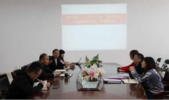 与云南省广播电视台共建新闻学院工作落实会。我校周峰越副校长,云南广电传媒集团公司副总经理、金彩影业董事长杨于明出席。