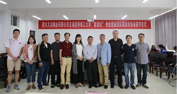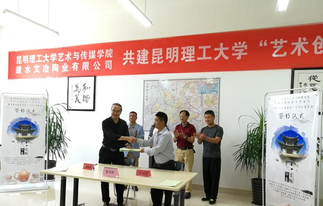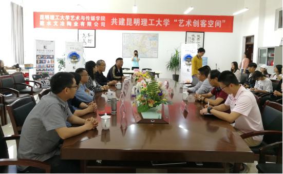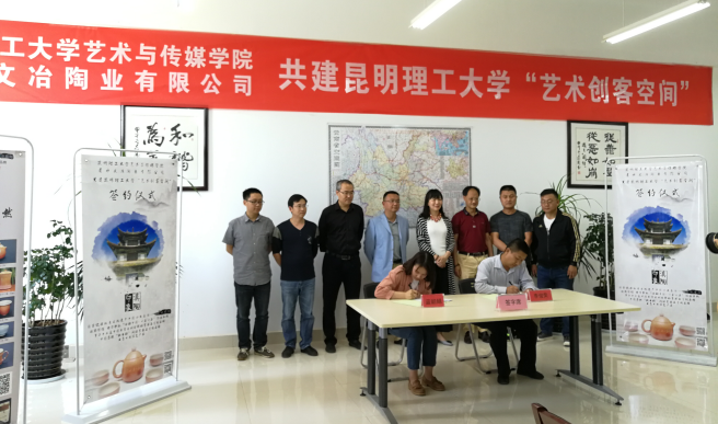 共建昆工“艺术创客空间”仪式在公教楼209召开,同时签订了建水文冶陶业支持艺传院“思源社”创新创业团队建设的协议。建水文冶总经理李俊荣一行3人、厂长影视