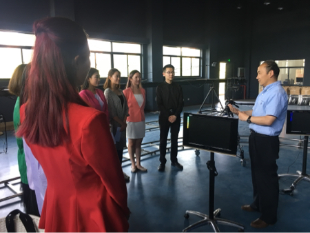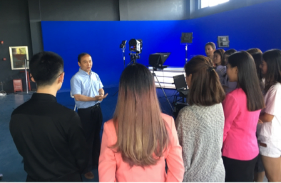 在演播室,播音与主持艺术专业2015级的同学们正在进行《节目主持艺术》课程新闻播报业务的练习。周峰越副校长观摩了同学们的练习情况,对同学们的表现进行了点评和指导,并就语言艺术的学习问题与同学们进行了交流。周副校长以俳句为例,勉励同学们在提升播音专业基本功的同时,要加强文化知识的学习和积累,领悟语言艺术的魅力,将美的语言通过美的声音传播出去。