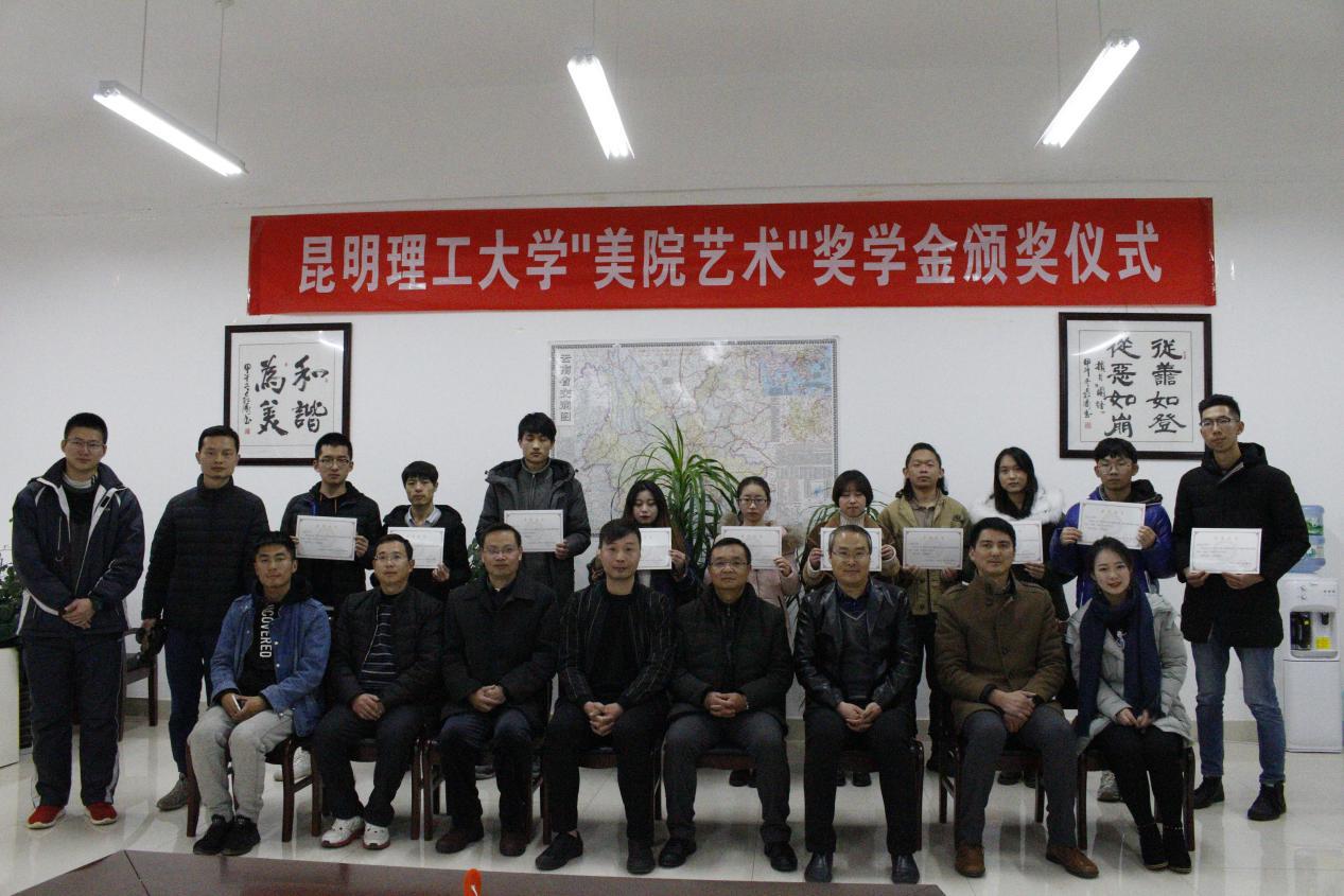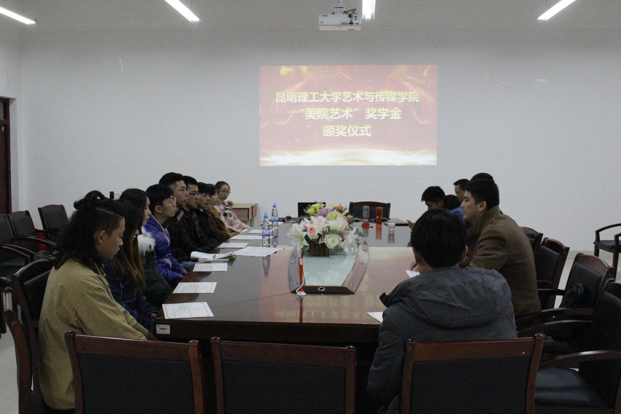 ‘美院艺术’奖学金颁奖仪式”,昆明美院画室校长“美院艺术”奖学金赞助者杨兰春、学院党委书记孙刚、学院党委副书记严波、学院副院长王勇、学院副院长张建国、院长助理李怀苍老师、大二大三辅导员老师以及和昆明美院其他两名老师出席本次颁奖仪式。