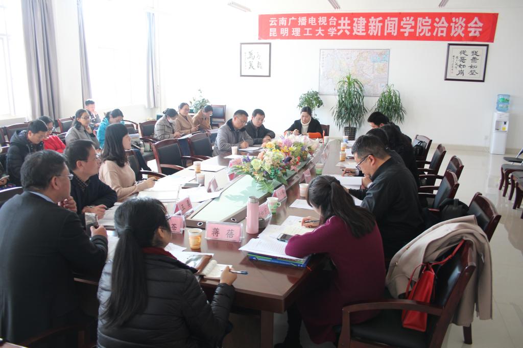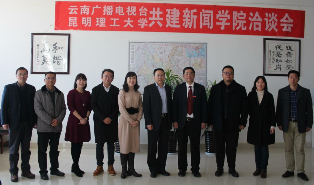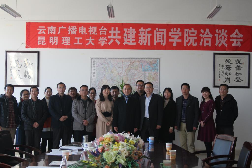 与云南广播电视台就共建新闻学院进行了深入研讨。云南播电视台副总经理杨于明、全媒体厂长影视副主任李汝松、新闻频率副总监文云红、云南广电传媒集团金彩影业公司副总经理钱虹宇、云南广播电视台人力资源部党支部副书记孙俊强等与厂长影视