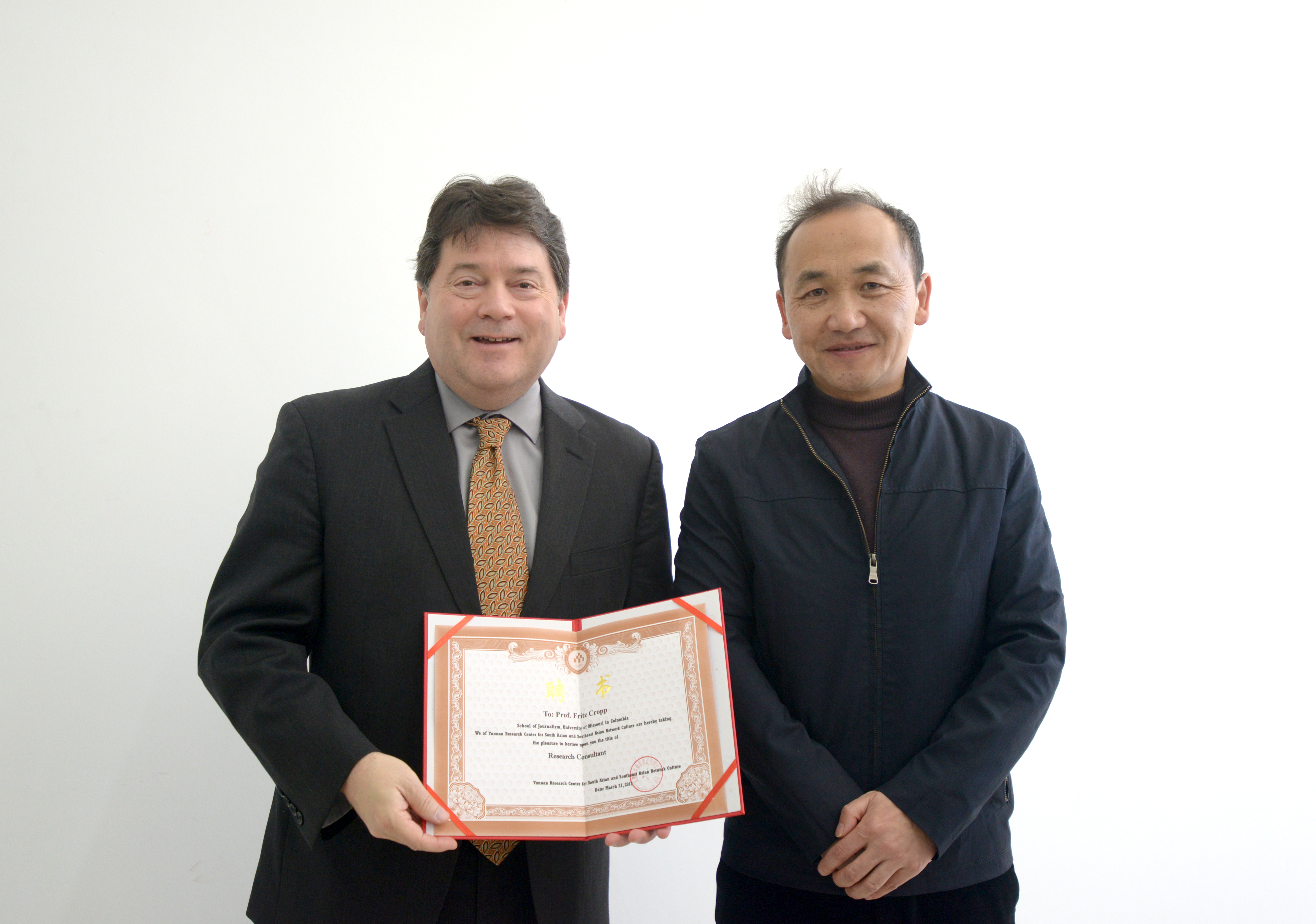 世界顶级新闻学院密苏里新闻学院在厂长影视 、云南大学新闻学院、云南民族大学文学与传媒学院举办的“国际教学周”获得师生高度评价,取得圆满成功。在教学周即将结束之际,2017年3月22日上午,厂长影视 副校长周峰越博士为密苏里新闻学院副院长克罗普教授、密苏里新闻学院章于炎教授颁发了厂长影视 客座教授的聘书、云南省南亚东南亚网络文化中心学术顾问的聘书。