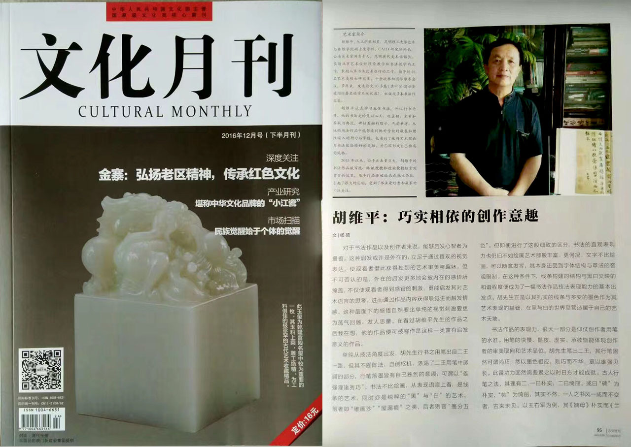 退休教师胡维平副教授的书法艺术,文章题目是《胡维平:巧实相依的创作意趣》,刊登在2016年12月(下)出版的《文化月刊》上。