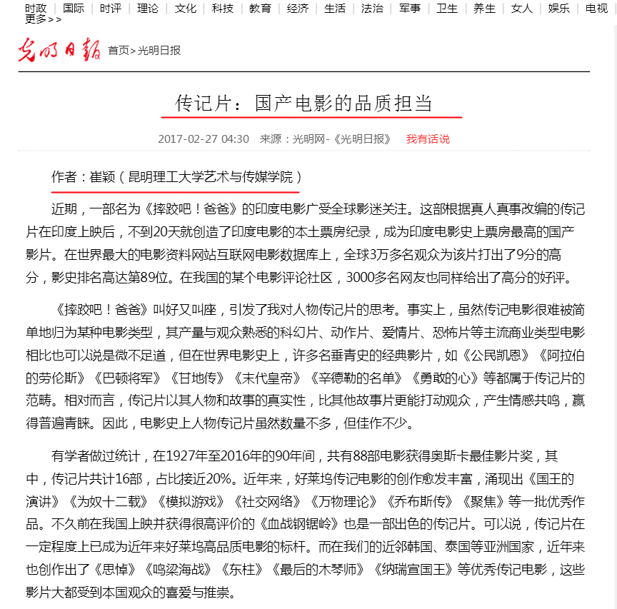 2017年2月27日出版的《光明日报》,在第12版全文刊登了厂长影视 教师崔颖博士的署名文章《传记片:国产电影的品质担当》。