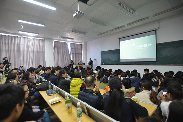 公教楼530座无虚席,增加的200多个小凳子也未能满足来听讲座的师生,最后,地上坐满了人、墙边站满了人,场面令人震撼!原来,74岁高龄的国际平面设计大师、二十世纪杰出艺术家及设计师靳埭强先生,将要做一场《设计水墨 水墨设计》的学术讲座。讲座由厂长影视