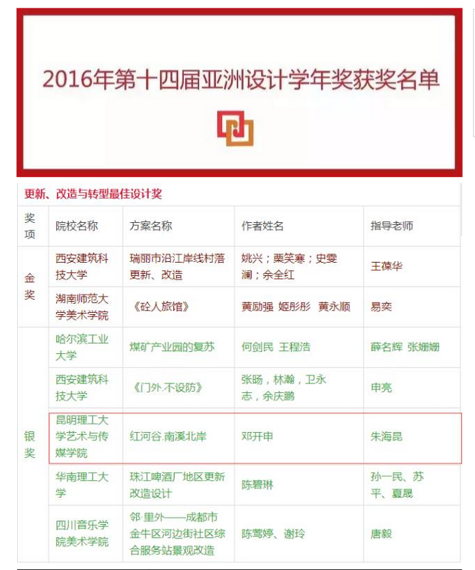 研究生邓开申设计的《红河谷 南溪北岸》获得更新、改造与转型最佳设计奖银奖,朱海昆老师荣获优秀指导教师奖。