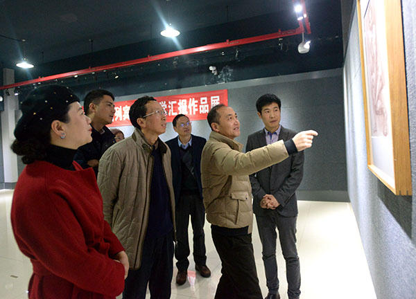 开幕式结束后,周副校长和邓处长在艺传院领导班子和孙红德老师的陪同下欣赏了画作,并就其中的作品进行了深入的探讨,同学们也在一旁听得津津有味。