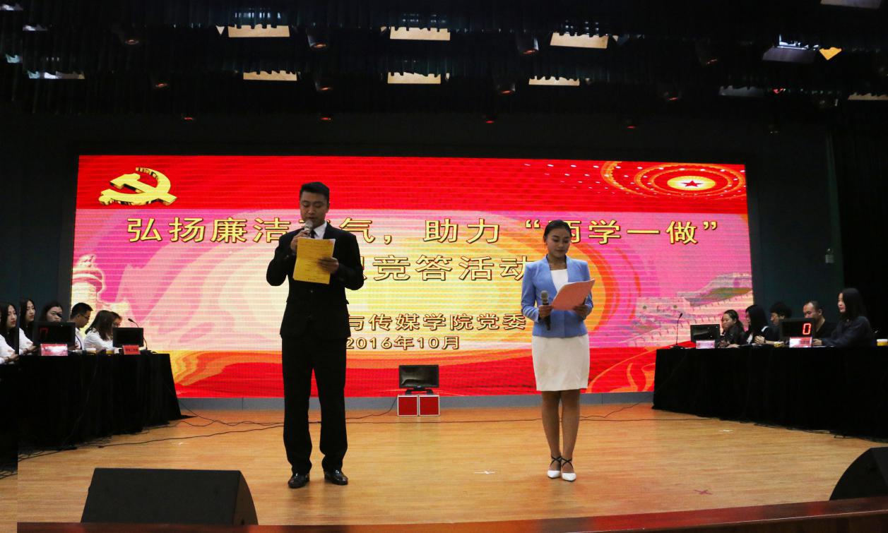 为了深入开展“两学一做”学习教育,助推学院廉洁从教、廉洁从学、廉洁从政的良好风尚深入人心,10月21日16:00,学院党委在小剧场举行了以“弘扬廉洁正气,助力‘两学一做’”为主题的知识竞赛活动。前来指导和观看比赛的有党委书记苏峰教授,副书记严波老师,学工办主任、学生第五支部支部书记郝儒梁老师,综合办主任、教工一支部支部书记李怀苍老师以及学生支部书记李霞老师、张瀚中老师。