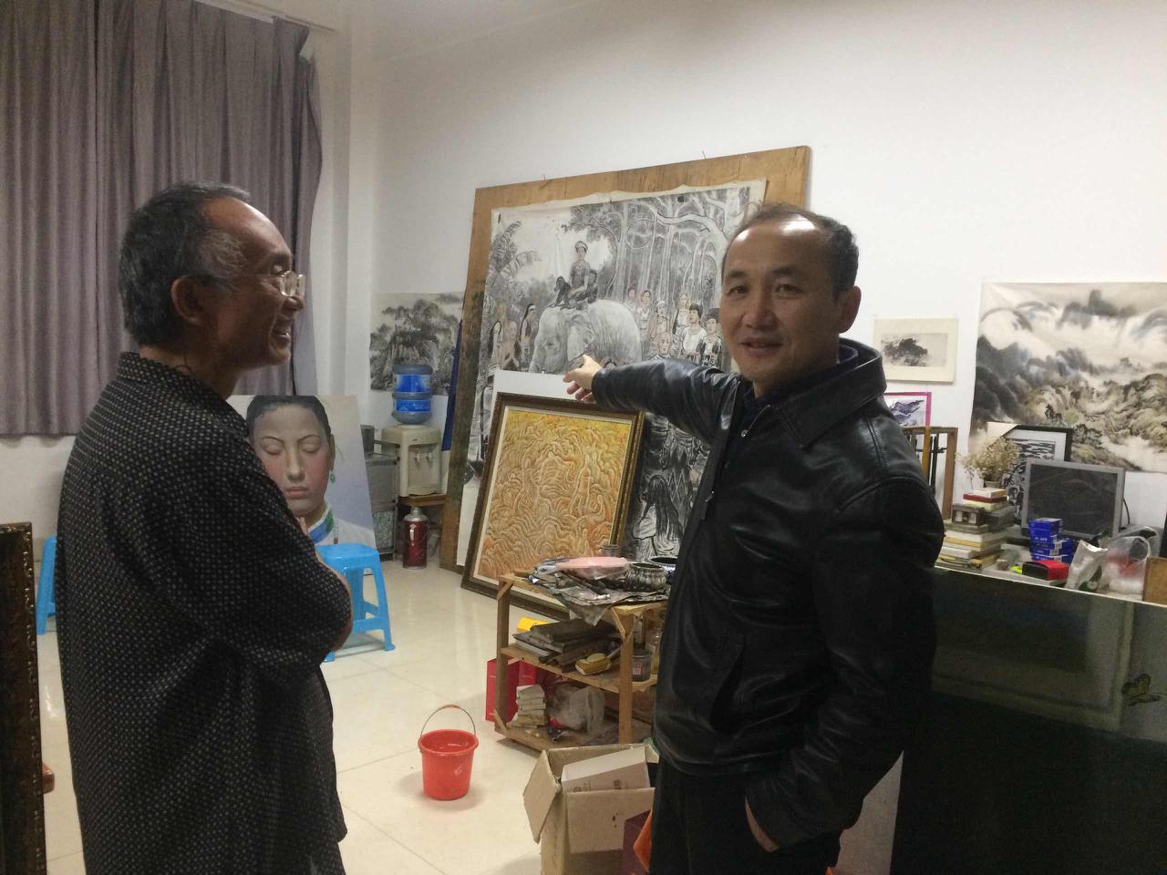 在李晓弟教授导师工作室,周校仔细看了李老师的画作,包括国画、油画、水彩、写生等,赞扬李老师具有深厚的功底;两人一起交流了学画的渊源、云南画界的历史与现状、云南高校艺术学科发展的情况。