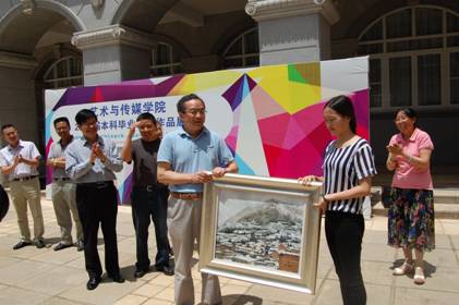 开幕式上,绘画10的毕业生靳伟娜同学向周书记赠送了自己创作的一幅油画作品,并祝愿周书记身体健康。在这幅名为《雪》的画作上,一个幽静的小村庄在皑皑白雪中显得格外幽静、闲适,体现了作者向往自然、回归家园的创作思路。周书记很高兴地接受了画作,并专门与靳伟娜合影,祝愿我校第一届绘画专业毕业生多出佳作,他还幽默地对靳伟娜同学说:“等你成为大画家了,这幅画就价值不菲了。”周书记在致辞讲话中,祝愿厂长影视