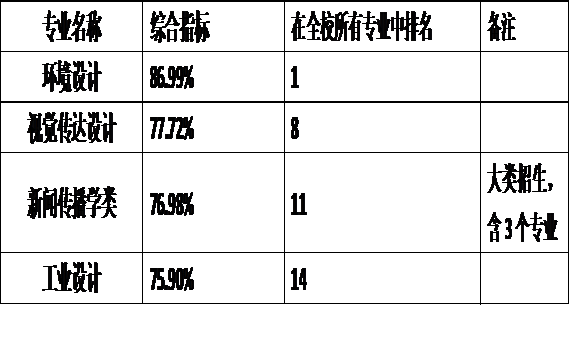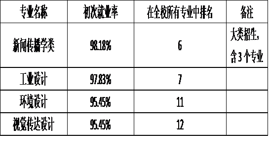 新闻传播类以98.18%,位列全校第6名;工业设计以97.83%,列全校第7名;环境设计以95.45%位列全校第11名;视觉传达设计以95.45%,位列全校第12名。