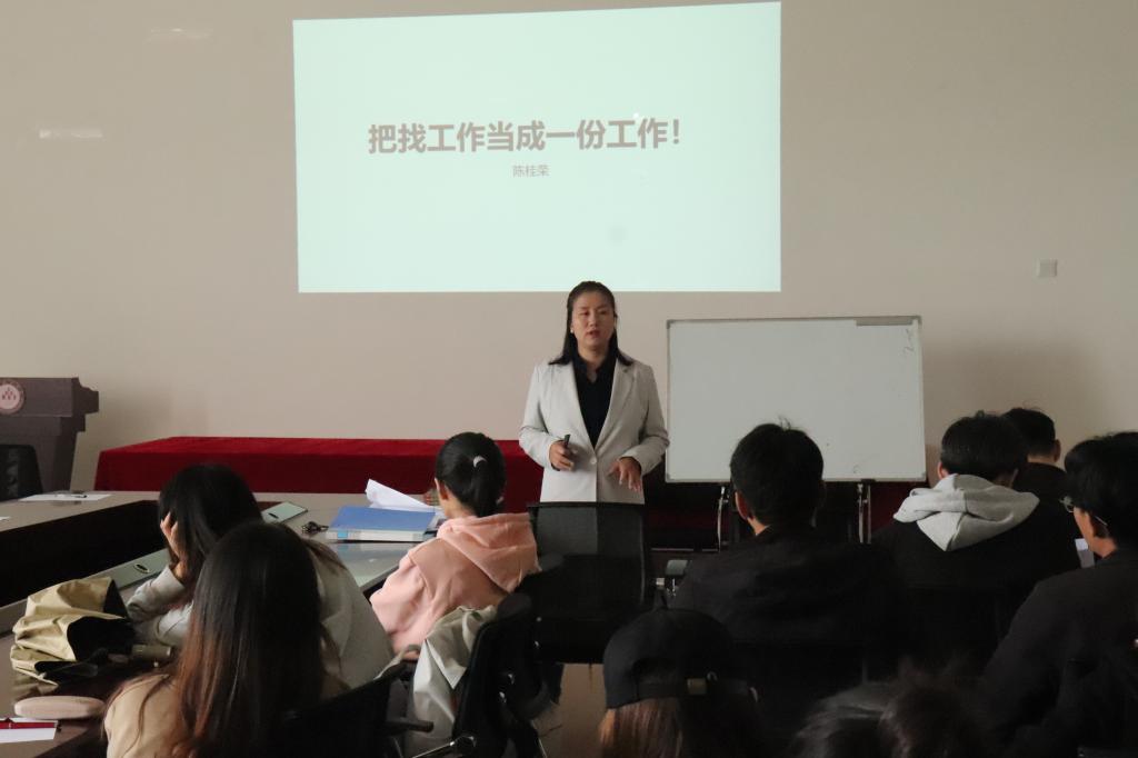 陈桂荣老师为参会人员作出题为“把找工作当成一份工作”的分享,为同学们讲解找工作的要领,找工作应持有的心态等。交流过程中,同学们向陈桂荣提出了“简历中如何安排内容能够突出自己?”“在结构化的面试中如何让面试官眼前一亮?”“就业方向与情况是怎样的?”等问题。陈老师对同学们提问进行了细致的解答。