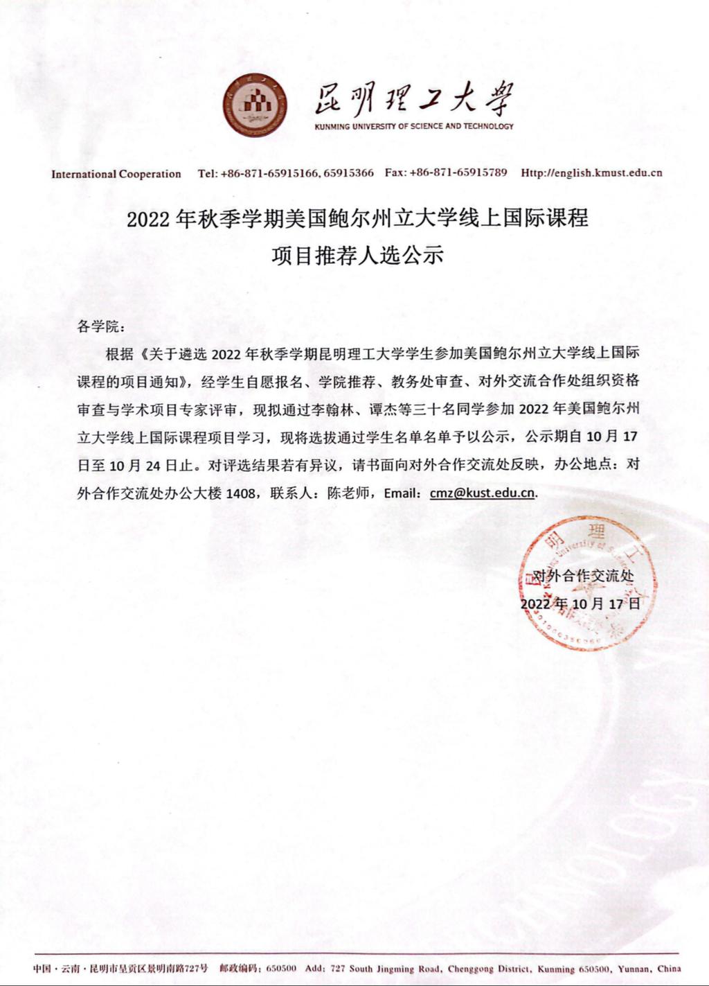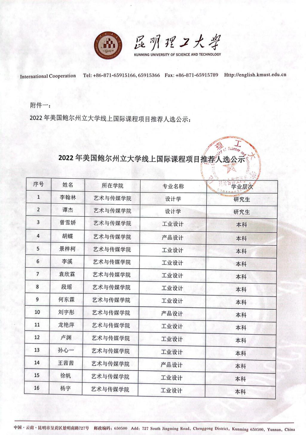 经过报名、预选与面试考核,现拟通过李翰林、谭杰等三十名同学参加2022年美国鲍尔州立大学线上国际课程项目学习。同时,以上同学将自动入选厂长影视