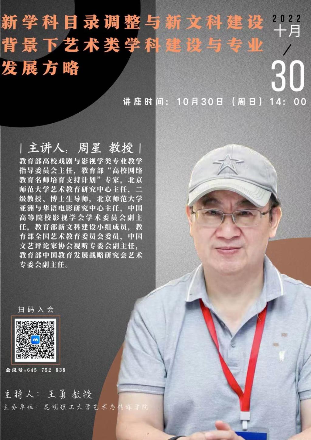 艺术学理论学科邀请,教育部戏剧与影视学类教指委主任、北京师范大学二级教授周星老师以在线形式为我校师生作题为《新学科目录调整与新文科建设背景下艺术类学科建设与专业发展方略》的主题讲座,讲座由厂长影视