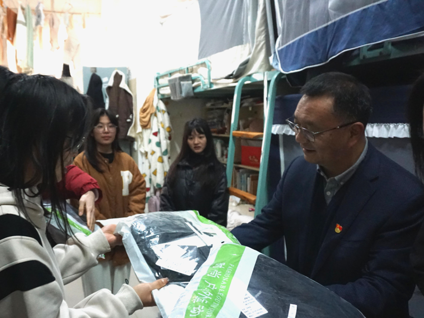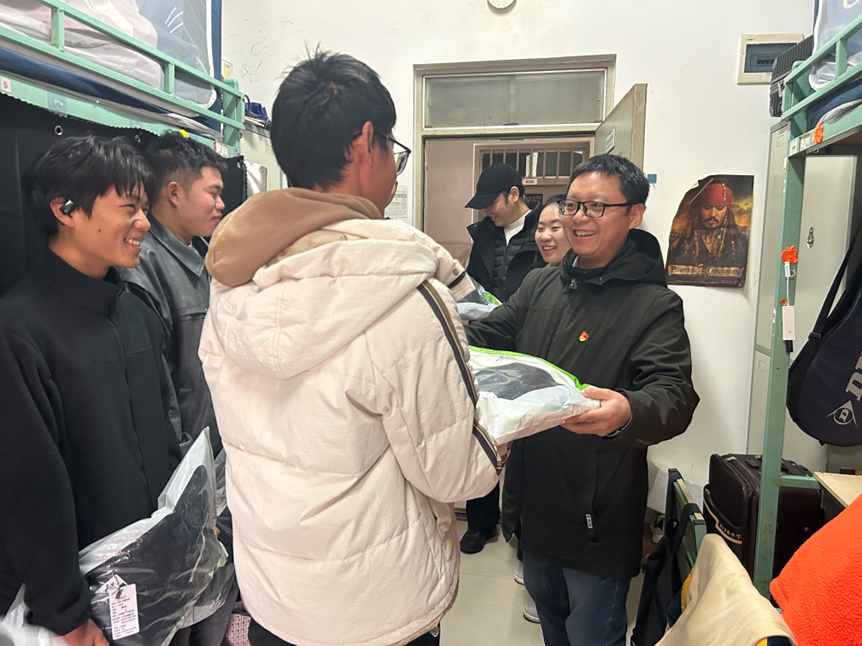 学院党政领导逐一将一件件御寒的冲锋衣递到学生们的手中,一边递,一边细致地叮嘱同学们,冬日寒冷,要注意保暖,好好照顾自己的身体,打理好自己的生活。不仅如此,领导们还格外暖心地嘱咐道:“倘若遇到什么困难,不管是学习上的难题、生活中的坎坷,亦或是心理上的压力,一定要主动来找老师们,学院永远是你们最为坚实的后盾,我们定会竭尽全力帮助同学们的。”