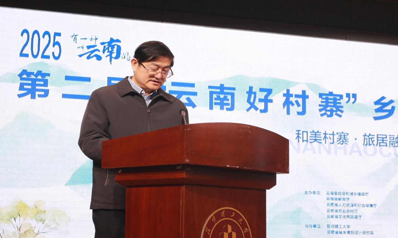 致辞环节中,云南省住房和城乡建设厅厅长尹勇首先发言。他指出,大赛以 “设计赋能乡村,公益点亮乡愁” 为初心,凝聚了社会各界对乡村建设的关注与支持,充分展现了设计在乡村振兴中的重要作用,并呼吁未来能有更多力量参与到乡村建设中,携手推动云南乡村高质量发展。